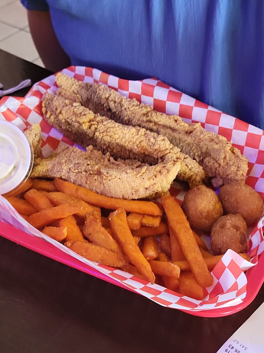 First time visiting and we weren't disappointed! Only things that need work were the hushpuppies, and chicken(po boy). Catfish was seasoned well and crispy. Shrimp were the same! Fries were top notch as well were the tartar/cocktail sauces. There was only one FOH employee and he was swamped but that didn't seem to bother him at all. Definitely will be back